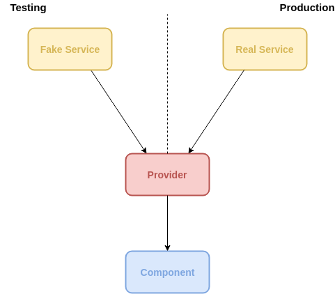 In the Angular team, they came up with a clever approach. Instead of relying on hard-coded imports, what they did they provided a mechanism that would let us inject our services before we initialize the component. With that approach, we can easily mock-up our services, because with the injection system it's very easy to control what implementation of the services is it gonna use. So this is how it would practically look like: