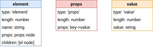 element,propsandvalue. Based on the node type we can also determine that additional properties that the node's going to carry. In our parser, each node type should have the following additional properties: